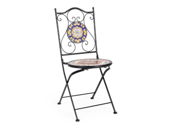 Siedzisko i oparcie zdobią przepiękne ceramiczne wzory inspirowane malowniczą architekturą greckiej wyspy Santorini, których eleganckie, geometryczne motywy nawiązują do tradycyjnego cykladzkiego stylu, harmonijnie współgrając jednocześnie z naturalnym pięknem śródziemnomorskiej estetyki.