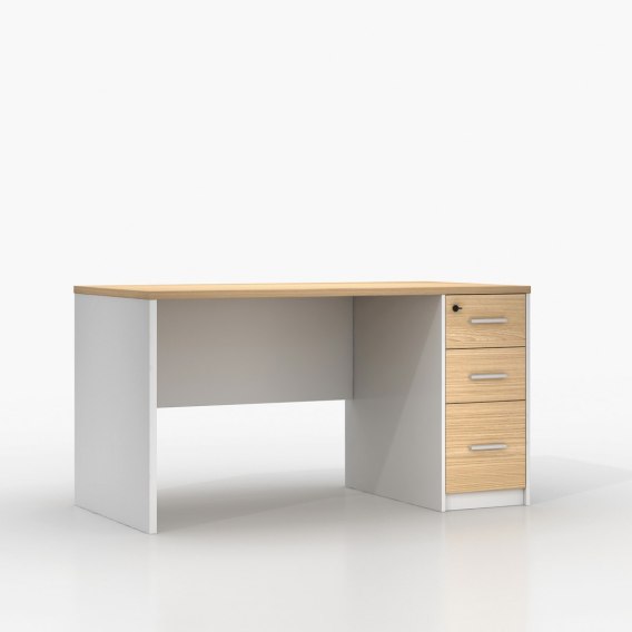 Trzy pojemne szuflady pomagają uporządkować dokumenty i akcesoria. Biurko świetnie komponuje się z jasnymi fotelami ergonomicznymi Angel, wprowadzając ład i lekkość do przestrzeni roboczej.
