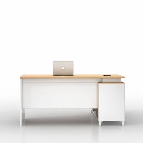 W wysuniętym elemencie bocznym znajduje się nie tylko praktyczna szuflada, ale również miejsce na komputer stacjonarny oraz otwarta półka na dokumenty. Biurko pozwala utrzymać porządek i wygodnie zorganizować stanowisko.