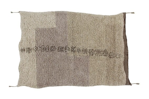 Kolekcja Africa - Dywan wełniany Amani Prostokątny dywan z wełny o nieregularnym kształcie z tkanymi afrykańskimi symbolami. Na wierzchu brązowego i naturalnie mieszanego płótna, dywan ma średnie runo z mieszanej przędzy, tworząc ombre obszary o miękkich ziemistych brązowo-beżowych odcieniach. Nierówne wykończenie brzegów i wełniane warkocze w szronie migdałowym na każdym rogu. Wymiary: 140x200 cm