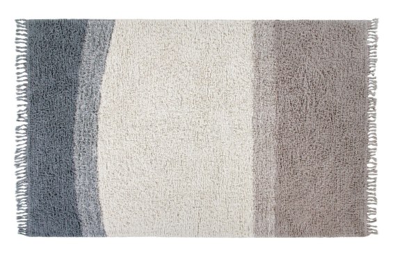 Into the Blue Medium to wełniany dywan do prania w pralce w kształcie prostokąta. Miękki w dotyku, w modnych kolorach: Smoke Blue, Natural oraz Silver Gray. Wykończony ręcznie robionymi frędzlami na krawędziach.
