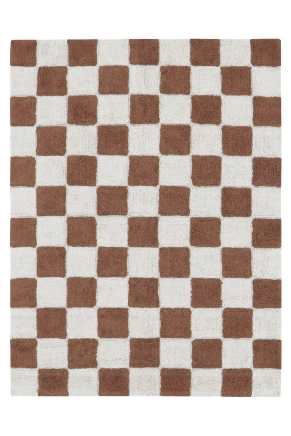Ten bawełniany dywan do prania w pralce ma wzór inspirowany vintage płytkami kuchennymi w szachownicę.