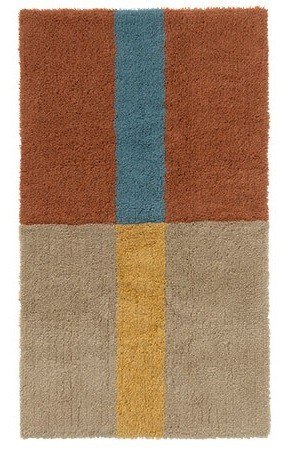 Wełniany dywan, który łączy w sobie nowoczesny design i funkcjonalność. Charakteryzuje się dużymi blokami w kolorach cynamonu i piaskowca, które są przełamane wyrazistymi pionowymi liniami w kolorze oceanicznego niebieskiego i karmelu.
