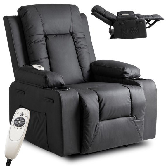 Fotel Masujący BOX Rozkładany Wypoczynkowy z Podnóżkiem Czarny Ekoskóra Nowoczesny