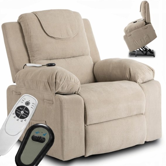 Fotel Masujący Elektrycznie Rozkładany FENIX z Funkcją Wstawania Beżowy Sztruksowy