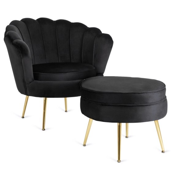 Fotel Wypoczynkowy GRAND z Podnóżkiem Muszelka Czarny Welurowy Glamour
