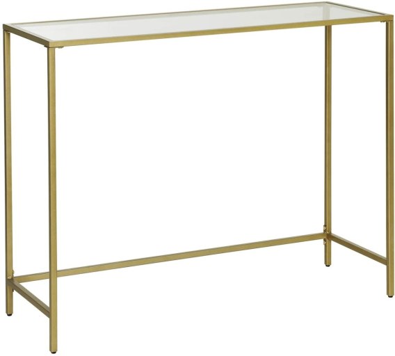 Konsola wykonana ze szkła i metalu malowanego proszkowo na kolor złoty. Produkt tworzy niesamowitą dekorację Twojego pomieszczenia. Półka konsoli jest stabilna, a więc możemy umieścić na niej książki, kwiaty w wazonach, ozdobne figurki, dziecięce zabawki oraz ramki ze zdjęciami. Odpowiednie wymiary konsoli zapewniają wystarczająco dużo miejsca na nasze rzeczy.