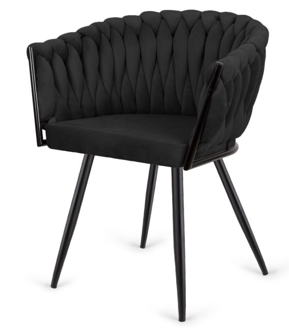 Stylowe i wygodne krzesło z plecionym oparciem, tapicerowane tkaniną welurową w kolorze czarnym.