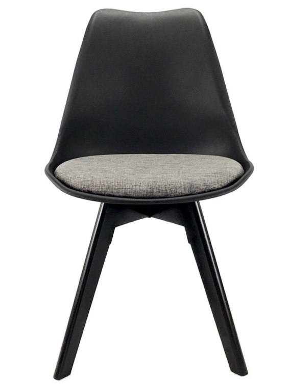 Nowoczesne krzesło skandynawskie do kuchni, jadalni, salonu lub gabinetu w kolorze czarnym, z miękką poduszką wykonaną z tkaniny lub ekoskóry.