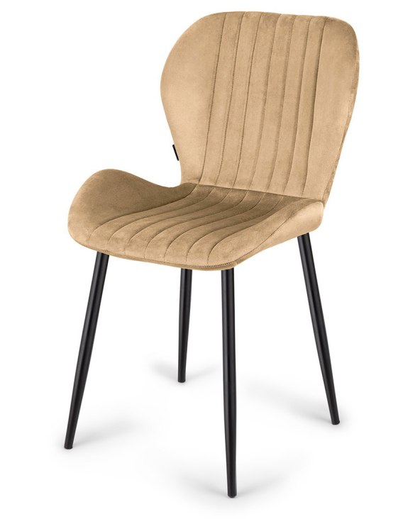 Nowoczesne krzesło tapicerowane welurową tkaniną w kolorze piaskowym ze złotymi nogami. Model MONTI, marki Lugano.