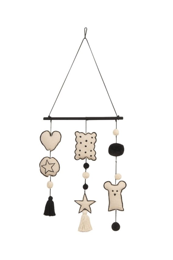 Dekoracja wykonana z 3 sznurków połączonych prętem wyłożonym bawełną. A na nich zawieszone małe poduszki z motywem reprezentującym niektóre kolekcje Lorena Canals, takie jak: biszkopt, miś, serce, gwiazdy i kropki. Na końcu każdego łańcucha jest pompon lub frędzle. Do tego modelu używane są tylko dwa kolory: naturalny kolor bawełny, bez barwników i czarny. Ta kombinacja kolorów sprawia, że ta dekoracja daje fajny i zabawny wygląd, nadaje się do pomieszczeń dla dorosłych i dla dzieci.