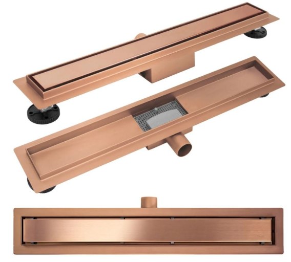 Maskownica w odpływie jest obustronna – z jednej strony miedź szczotkowana, a z drugiej przystosowana do wklejenia płytki, co pozwala na idealne dopasowanie do aranżacji wnętrza. Dzięki takiemu rozwiązaniu odpływ pozostaje dyskretny, a cała strefa prysznicowa nabiera minimalistycznego i eleganckiego charakteru.