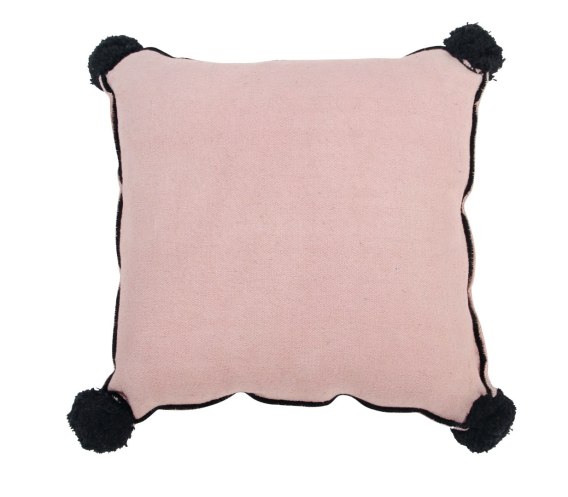 Kwadratowa poduszka w gładkim, jednolitym kolorze. Krawędź haftowana jest ręcznie czarną nicią. Każdy narożnik jest wykończony czarnym pomponem.