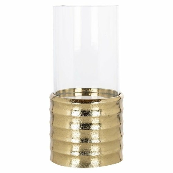 Falista, złota podstawa wprowadza luksusowy akcent do wnętrza, podczas gdy szklana osłona subtelnie rozprasza światło świecy, tworząc przytulną atmosferę.