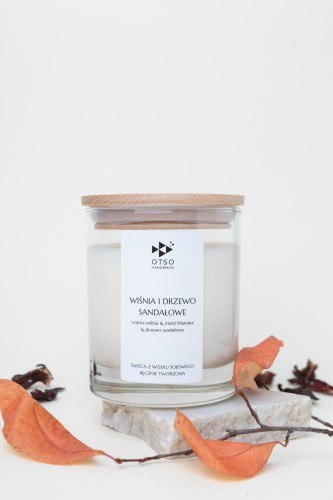 Świeca sojowa Wiśnia i drzewo sandałowe Świeca z wosku sojowego z drewnianym skwierczącym knotem i drewnianym wieczkiem Świeca sojowa Wiśnia i drzewo sandałowe Nuty głowy: czarna wiśnia, akord mleczny Nuty serca: miód Manuka, gałka muszkatołowa, orzech laskowy Nuty bazowe: bogata wanilia, kremowe drzewo sandałowe To zmysłowa, kremowa kompozycja, która łączy w sobie słodycz i aksamitne ciepło, niczym deser podany w eleganckiej scenerii. Całość to harmonia ciepła i kremowości - zapach idealny dla tych, którzy kochają otulające i uwodzicielskie kompozycje z owocowym akordem. Nuty głowy rozpoczynają się aksamitnym akordem mlecznym, który otula i nadaje miękkiego charakteru, a czarna wiśnia dodaje soczystości i lekko cierpkiej słodyczy. To jak pierwszy kęs aksamitnego wiśniowego musu. Serce zapachu wprowadza nuty głębokiej słodyczy i przypraw. Miód Manuka nadaje unikalnej, intensywnie słodkiej aury, a gałka muszkatołowa wprowadza korzenną wyrazistość. Orzech laskowy dopełnia całość, dodając subtelnej, lekko prażonej nuty, która wprowadza poczucie komfortu. Baza to prawdziwa uczta dla zmysłów - bogata wanilia łączy się z kremowym drzewem sandałowym, tworząc głęboki, zmysłowy akord, który trwa i otula. Drewno sandałowe wprowadza delikatne, balsamiczne tło, nadając zapachowi wyjątkowej miękkości i elegancji. Pojemność szkła 250 ml / czas palenia do 55 h Co powoduje, że świece sojowe OTSO HANDMADE są wyjątkowe: Sojowe świece zapachowe w całości wytwarzamy ręcznie w Polsce ze 100% naturalnego wosku sojowego, który jest biodegradowalny i przyjazny środowisku Wosk sojowy z którego produkujemy nasze świece nie zawiera ropy naftowej i jej pochodnych, herbicydów, pestycydów oraz toksyn Spala się o 50% wolniej niż parafina, co pozwala dłużej cieszyć się z pięknego zapachu oraz atmosfery jaką tworzy nasza świeca Świece z wosku sojowego emitują o 90% mniej dwutlenku węgla niż świece parafinowe Idealne dla wegan Kluczem jest prosty skład: specjalnie dobrana kompozycja w pełni wegańskich wosków sojowych nieimpregnowany drewniany knot, który lekko skwierczy i pyrka podczas palenia misternie dobrana kompozycja naturalnych olejków zapachowych Chcesz dłużej cieszyć się naszą świecą, przeczytaj proszę: Świeca powinna palić się na tyle długo aby górna warstwa wosku roztopiła się od brzegu do brzegu naczynia. Pozwoli to nabrać mocy zapachowi świecy oraz zapobiec tworzenia się tzw. tunelu Przed każdym użyciem świecy należy skrócić knot do ok. 0,5 cm., dzięki temu prostemu zabiegowi płomień będzie palił się równo Nie zostawiaj świecy bez nadzoru, w miejscu dostępnym dla dzieci lub zwierząt, oraz w pobliżu materiałów łatwopalnych