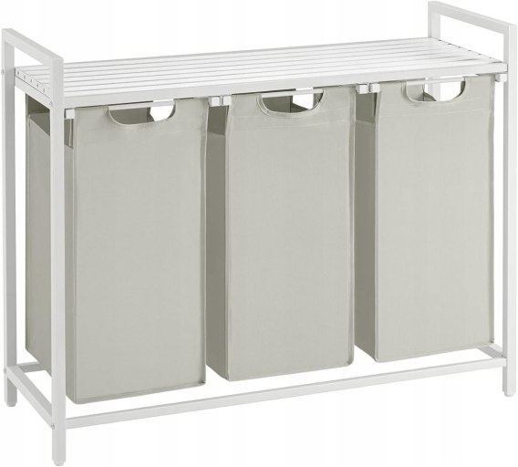 Praktyczny, trzykomorowy kosz na pranie i bieliznę o łącznej pojemności 114 l został wykonany z bardzo dobrze prezentujących się listewek z płyty MDF połączonych ze sobą stalową ramą. Odpowiedni dobór materiałów sprawia, że produkt jest odporny na ewentualne uszkodzenia. Pojemnik znajdzie swoje zastosowanie w pralni, łazience, a nawet w pokoju dziecięcym służąc za kosz na zabawki. Już dziś zaprowadź porządek w swoim domu razem z trzykomorowym koszem, który ułatwi Ci segregację prania. Uniwersalność oraz praktyczność sprawią, że kosz będzie jednym z Twoich ulubionych mebli w domu. Meble w stylu nowoczesnym to ostatni krzyk mody. Kosz na pewno wpasuje się w wystrój niejednego pomieszczenia. Stalowa konstrukcja zapewnia stabilność mebla. Idealnie spasowane elementy ramy oraz biała oprawa blatu nadadzą Twojemu wnętrzu wdzięku. Zadbaj o estetykę swojej łazienki, pralni czy pokoju dziecięcego wybierając produkty sprawdzone, o najwyższej jakości wykonania.