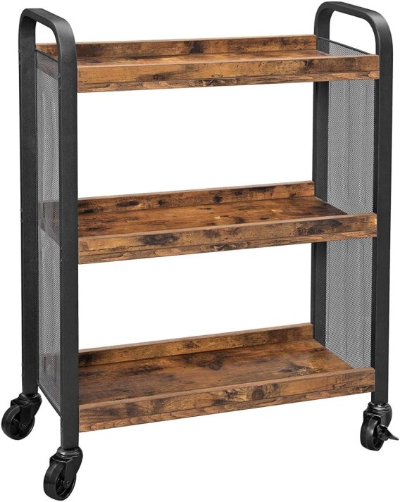 Wózek wykonany w stylu rustykalnym, czyli odpowiednio stylizowanym na wiekowy. Rewelacyjna mobilna szafka na kółkach idealna do kuchni, spiżarni, a nawet sypialni i biura. Szafka została stworzona tak, aby zagospodarować wąskie przestrzenie oraz ułatwić dostęp do najczęściej używanych produktów. Dzięki niej zyskujemy dodatkową przestrzeń, pomaga nam również utrzymać porządek w domu.